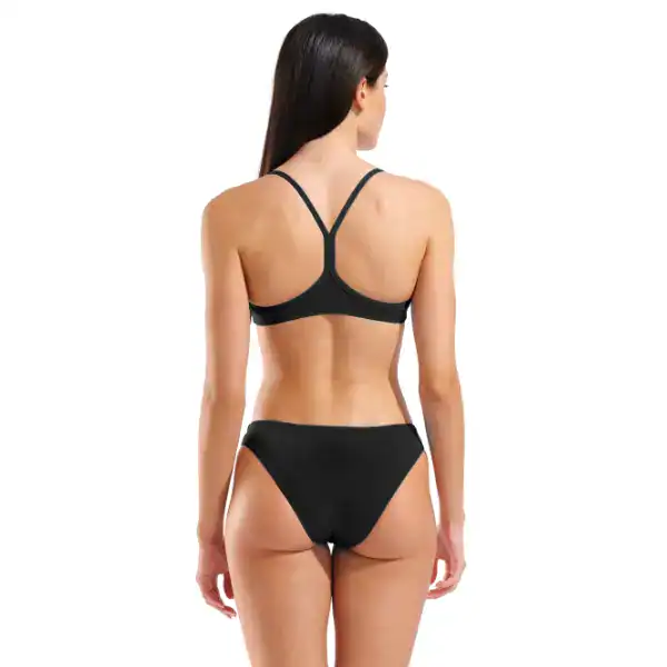 Bandeau gornji dio s tankim naramenicama otkriva leđa i pruža maksimalnu slobodu pokreta te smanjuje otpor vode, a istovremeno daje elegantan, minimalistički izgled. Donji dio s unutarnjim vezicama osigurava sigurno i udobno prianjanje, dok puna podstava pruža dodatnu udobnost.